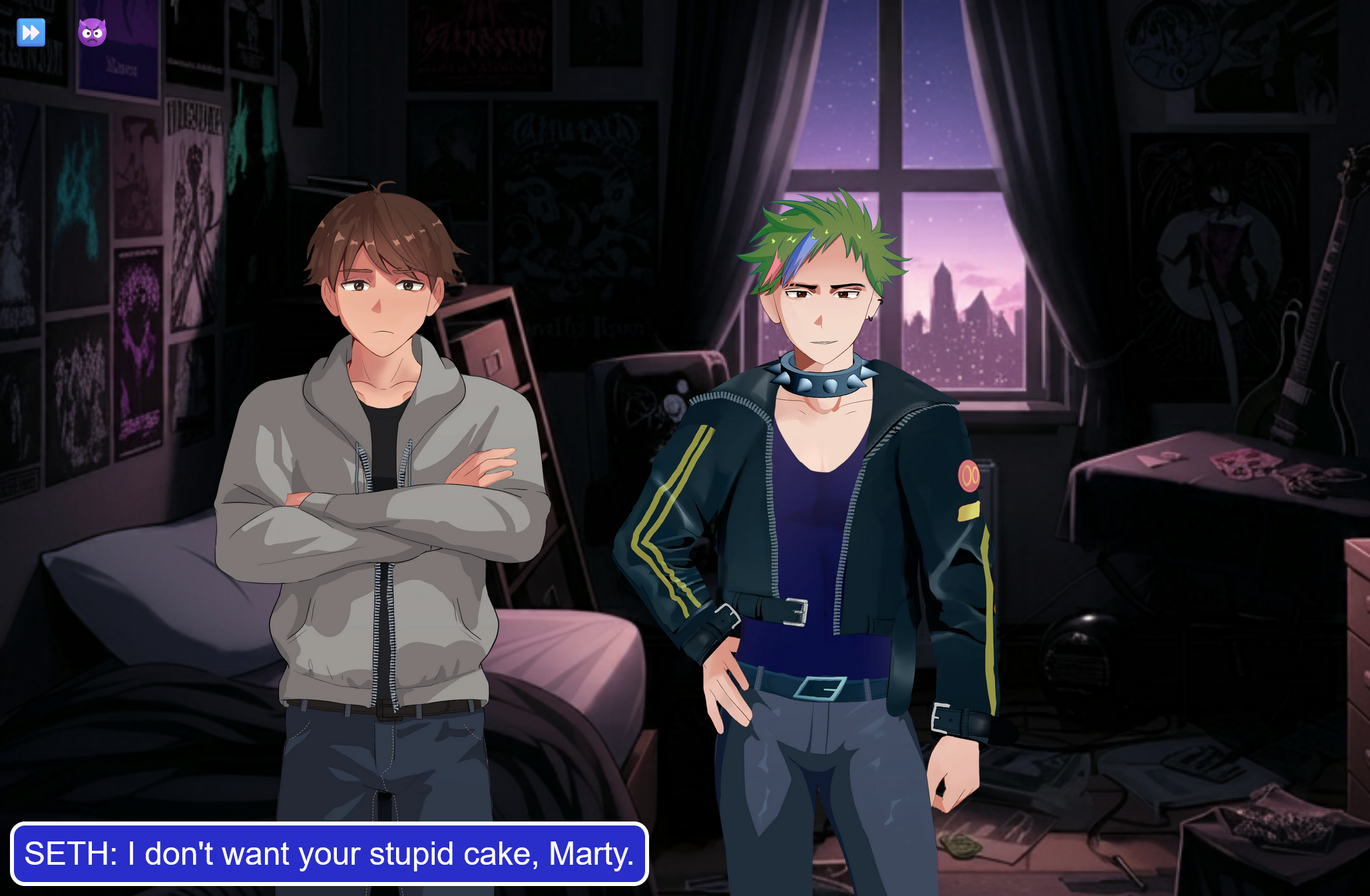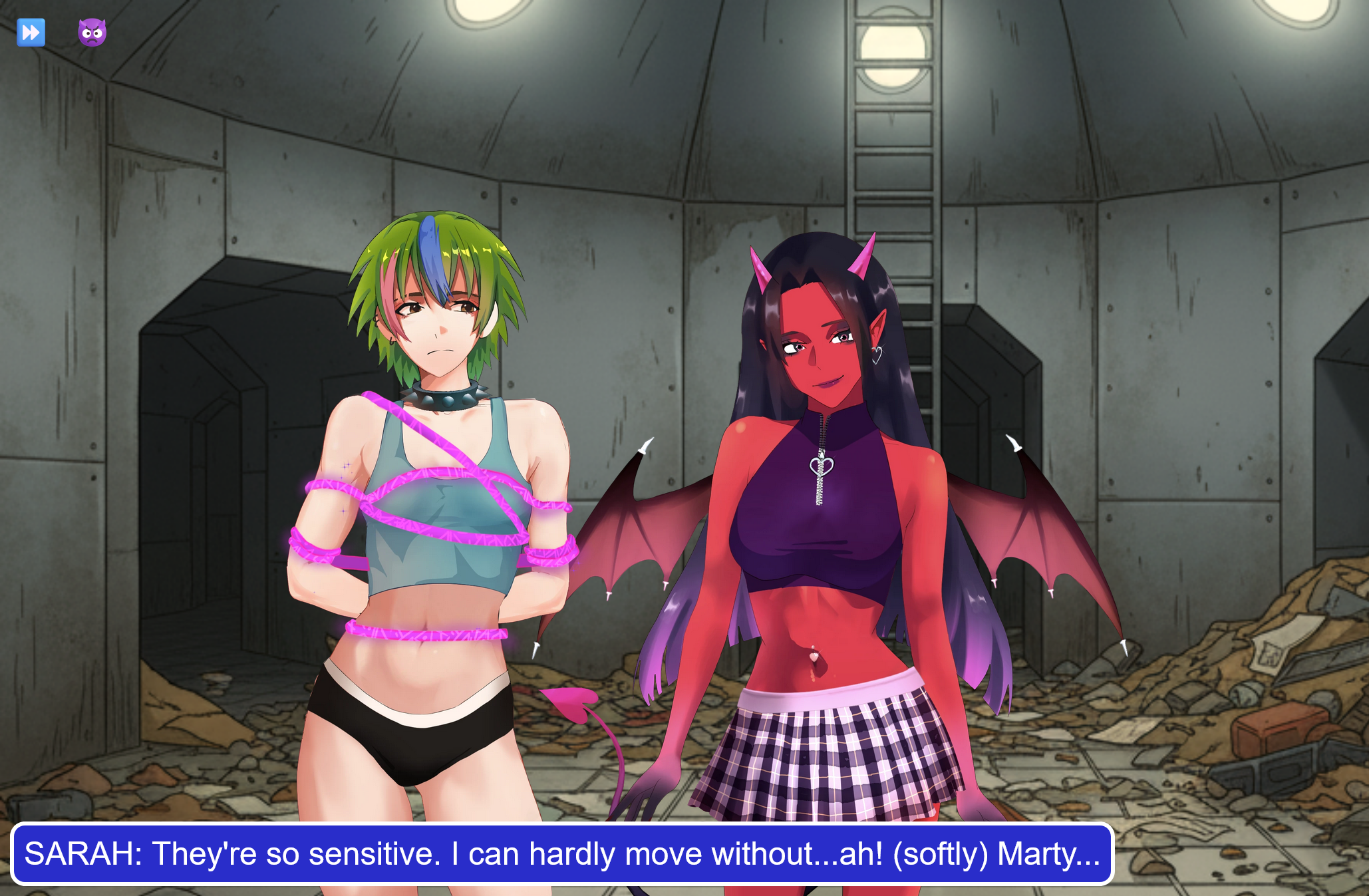 • A dice-based strategy game.  Gameplay is a mix of visual novel scenes and a simple dice based strategy game where you complete challenges to corrupt Sarah.  As you play, you’ll get better dice and equipable spells that let you take on bigger challenges.